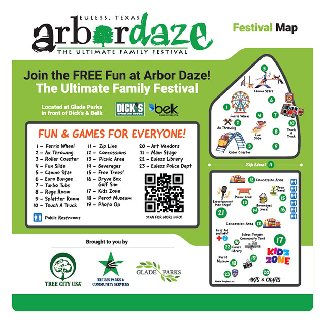 Sponsorship opportunities for local businesses, or organizations are available for Arbor Daze this 2026! We have several different tier options available for this years event. Arbor Daze will return to Glade Parks retail shopping area. Join us with making this event bigger and brighter for the community of Euless! We are expecting over 8000 guests to visit the event with new additions such as but not limited to: (alcohol sales with a beer garden, new carnival rides, new concessions, arts & crafts vendor area, and more! Learn more about the Arbor Daze Sponsorship Tiers to find which tier best fits your organization today! For more information, contact Alex Harvey at 817-685-1449 or aharvey@eulesstx.gov